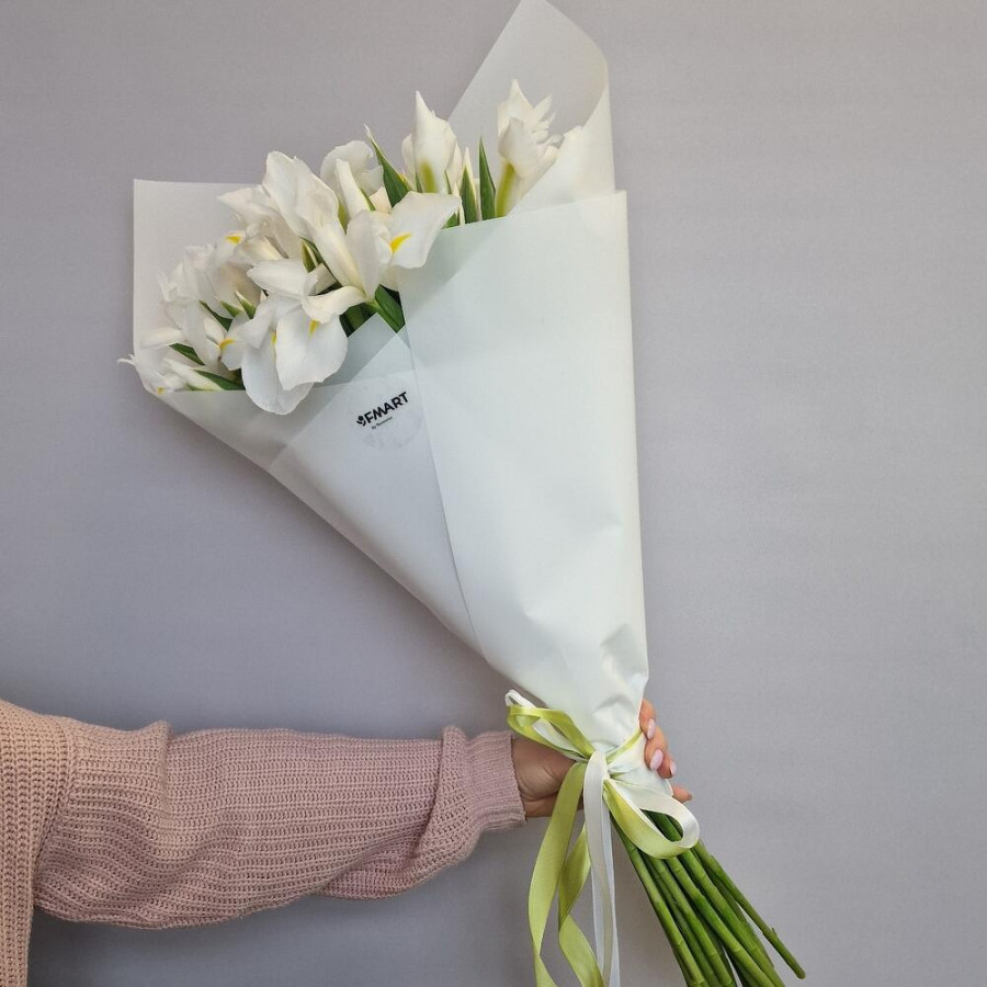На фото букет 19 белых ирисов. В составе: ирис 19 шт, дизайнерская упаковка 1 шт, атласная лента 1 шт, . Все цветы свежие и ароматные, букет красиво оформлен и отлично подходит для подарка. Доступна доставка цветов или самовывоз.