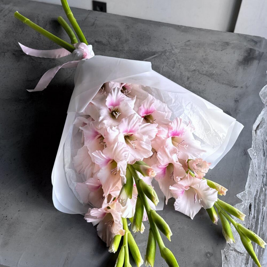 На фото букет из 3 розовых гладиолуса. В составе: гладиолус 3 шт, дизайнерская упаковка 1 шт, атласная лента 2 шт, . Все цветы свежие и ароматные, букет красиво оформлен и отлично подходит для подарка. Доступна доставка цветов или самовывоз.
