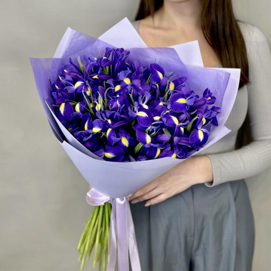 На фото букет из 51 синего ириса. В составе: ирис 51 шт, дизайнерская упаковка 2 шт, атласная лента 2 шт, . Все цветы свежие и ароматные, букет красиво оформлен и отлично подходит для подарка. Доступна доставка цветов или самовывоз.