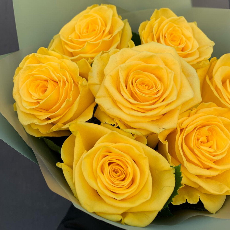 На фото букет из 7 желтых роз. В составе: роза 7 шт, дизайнерская упаковка 1 шт, атласная лента 1 шт, . Все цветы свежие и ароматные, букет красиво оформлен и отлично подходит для подарка. Доступна доставка цветов или самовывоз.