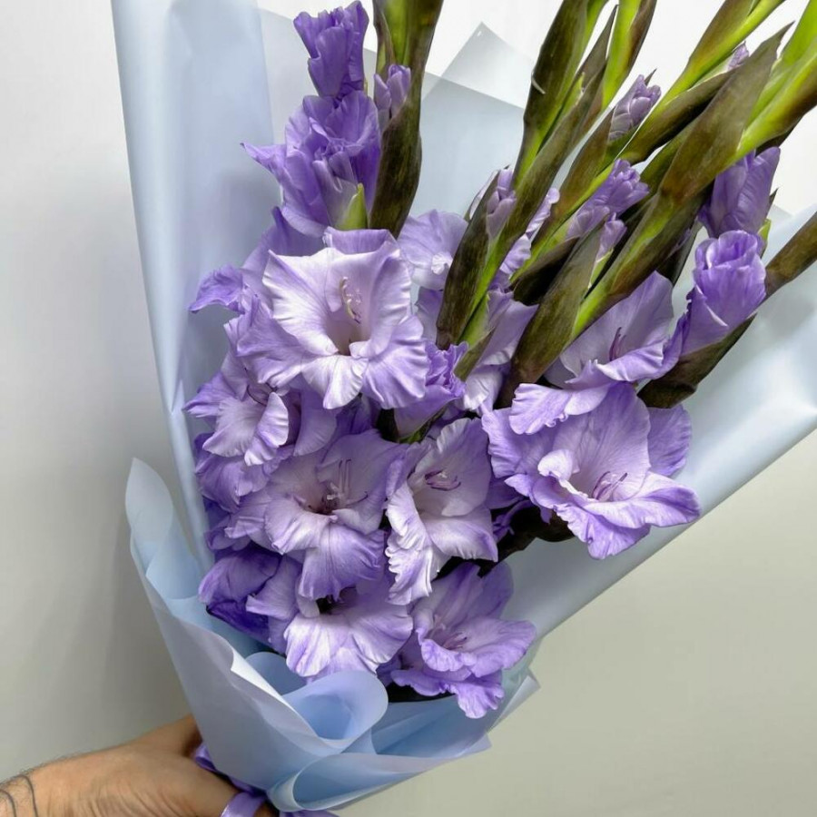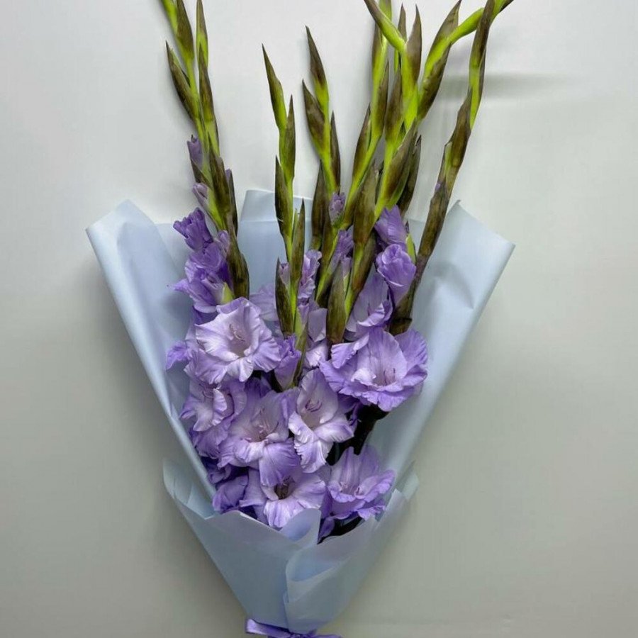 На фото букет из 9 лиловых гладиолусов. В составе: гладиолус 9 шт, дизайнерская упаковка 1 шт, . Все цветы свежие и ароматные, букет красиво оформлен и отлично подходит для подарка. Доступна доставка цветов или самовывоз.