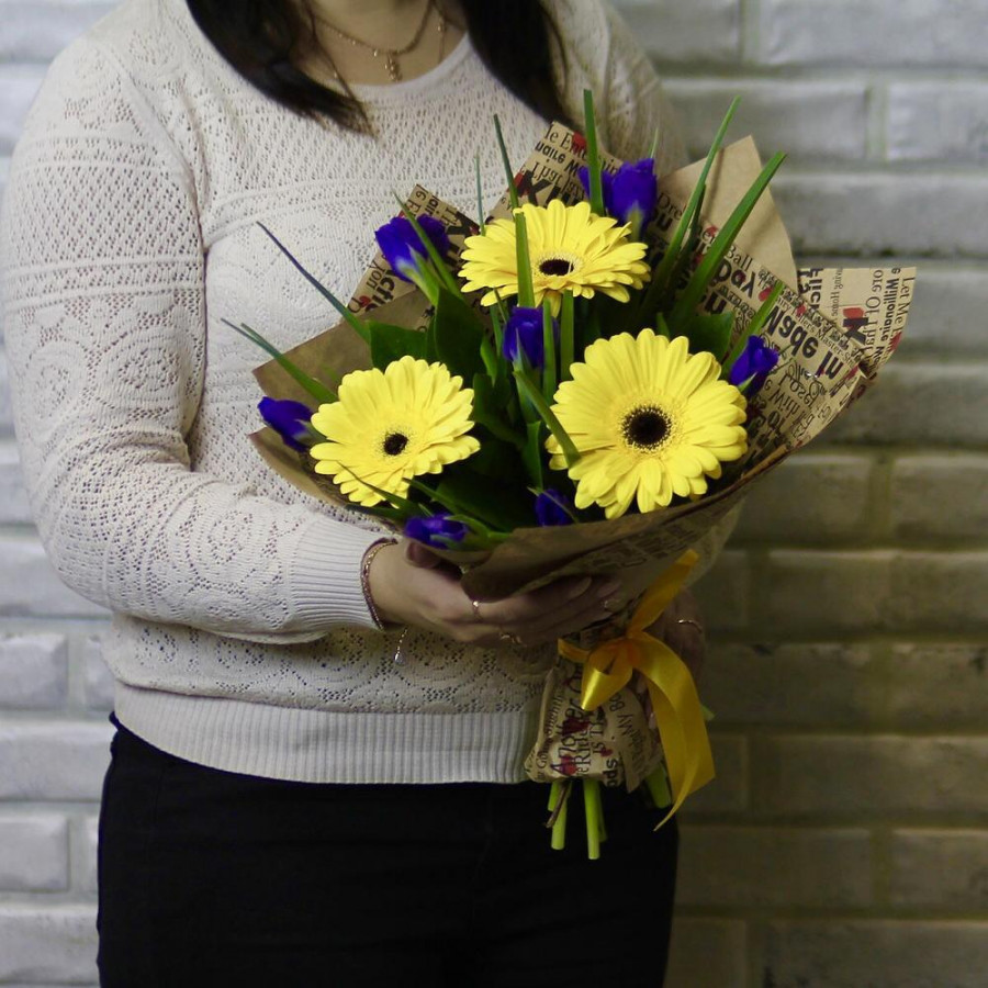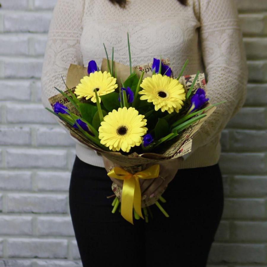 Букет из желтых гербер с синими ирисами в Лениногорске