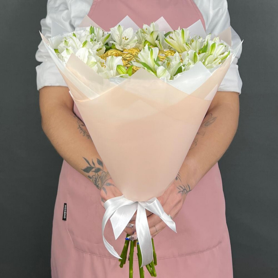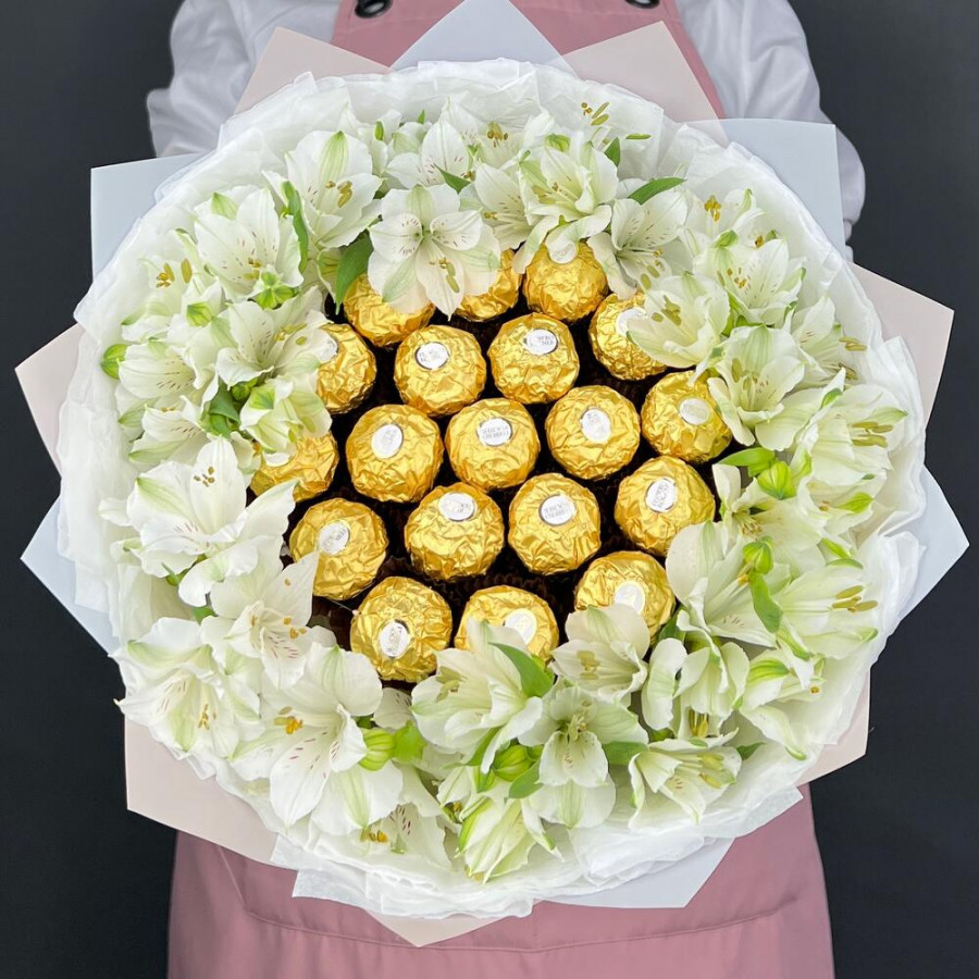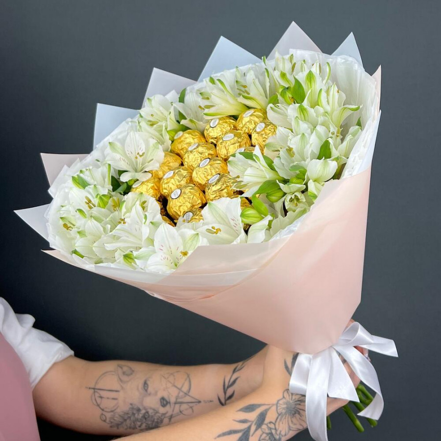 Букет из конфет Ferrero Rocher и и альстромерии в Лениногорске
