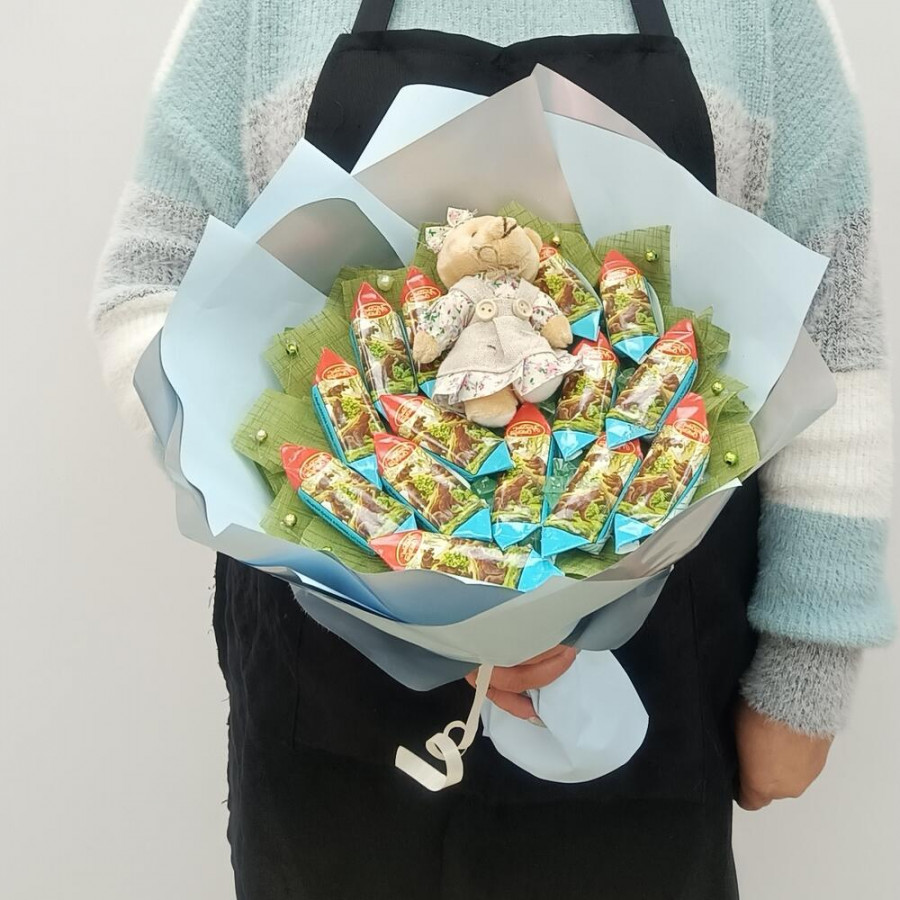 Лента атласная - 1 шт. Упаковка дизайнерская - 2 шт. Мишка плюшевый - 1 шт. бусинки - 25 шт. конфеты мишка косолапый - 14 шт.